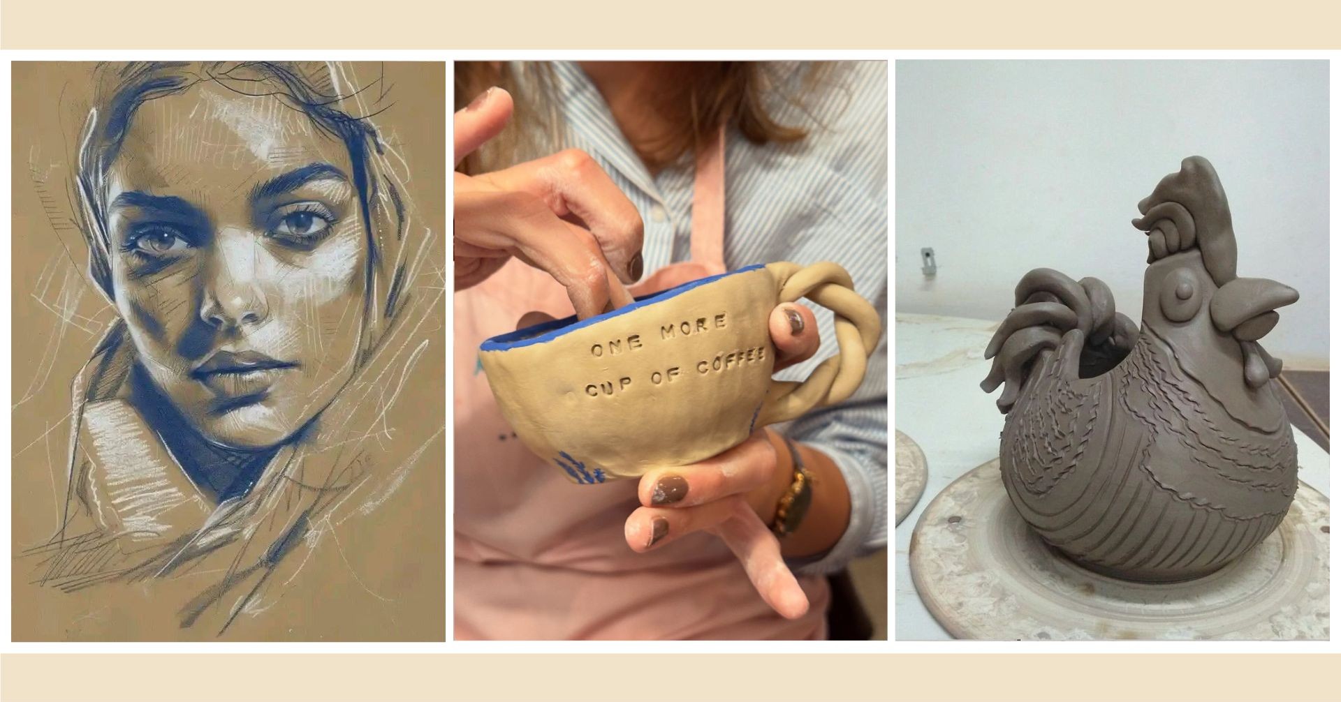 Poseban naglasak stavljamo na praktično iskustvo — polaznici ne samo da uče tehnike, već na kraju svakog tečaja odlaze kući s vlastitim radovima: grafikom, keramikom, skulpturom ili portretom.